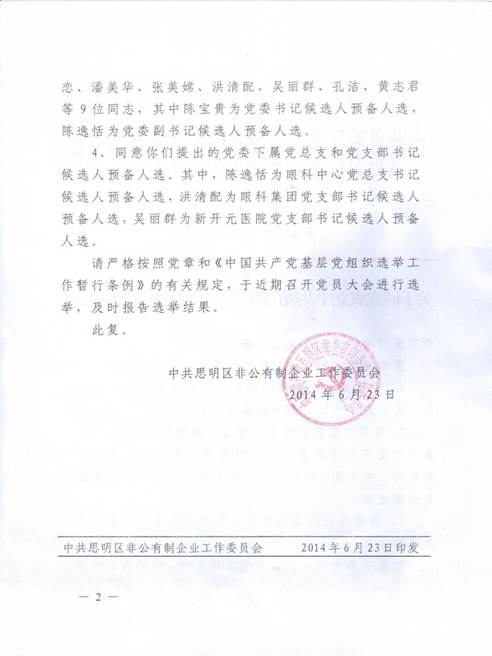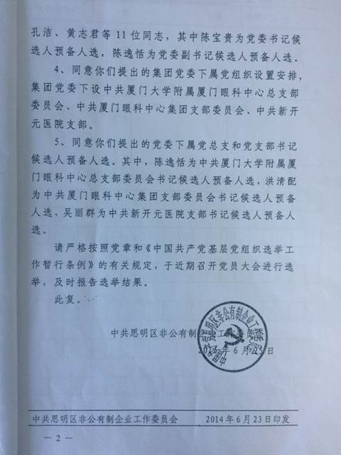 根据中共中央关于加强“非公党建” 的要求和厦门眼科集团的发展需要,中共思明区非公有制企业工作委员会于2014年同意成立中共厦门市眼科中心集团委员会(后更名为中共易游体育集团委员会)。