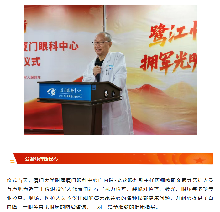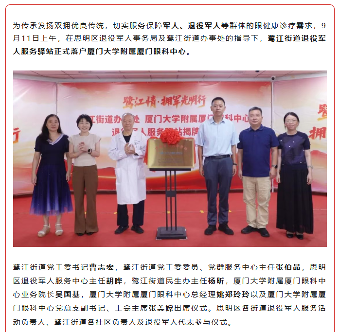搭建健康拥军新平台,鹭江街道退役军人服务驿站落户厦门眼科中心