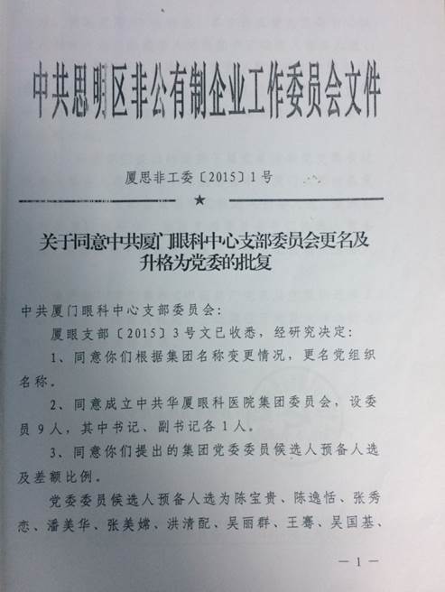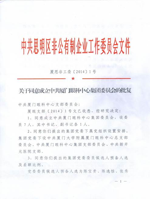 根据中共中央关于加强“非公党建” 的要求和厦门眼科集团的发展需要,中共思明区非公有制企业工作委员会于2014年同意成立中共厦门市眼科中心集团委员会(后更名为中共易游体育集团委员会)。