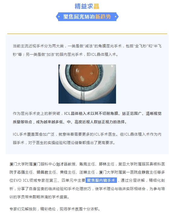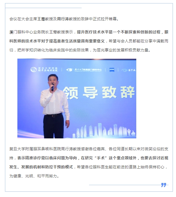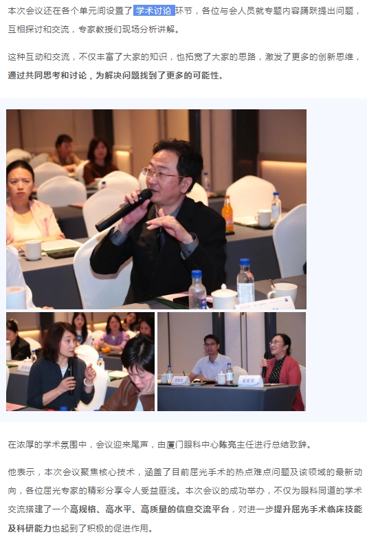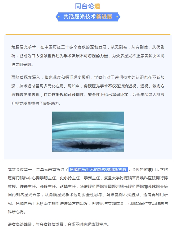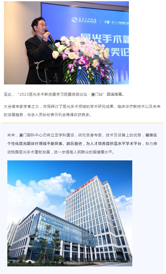 为推动屈光领域的学术交流与医学质量的不断提升和发展,11月11日,由厦门大学附属厦门眼科中心、复旦大学附属眼耳鼻喉科医院联合举办的“2023屈光手术新进展学习班暨微笑论坛·厦门站”在厦门五缘水乡酒店隆重举行。全国屈光领域专家齐聚一堂,就角膜屈光、晶体植入两类手术的技术进展和临床研究,通过专题讲课、手术录像分析、讨论答疑等形式横向解读、纵深剖析,以更宽广的视野,和现场的眼科同仁展开深刻的交流分享,呈现了一场精彩的学术对话与思想盛宴。