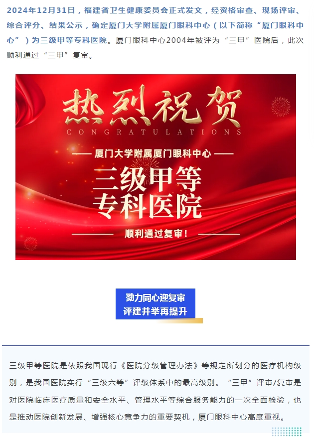 喜讯!厦门大学附属厦门眼科中心顺利通过三甲复审!