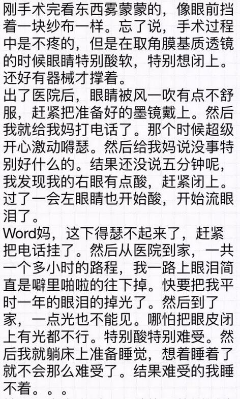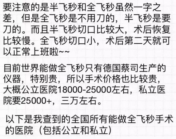 你好!我是2016年12月18日在和平眼科做过全飞秒的患者~现在已经摘掉眼镜了,特别开心!附件有一个我写的分享,一共是7页图片,希望能给其他还没做或者犹豫做手术的朋友们带来帮助。写了好几晚,终于写完了~
