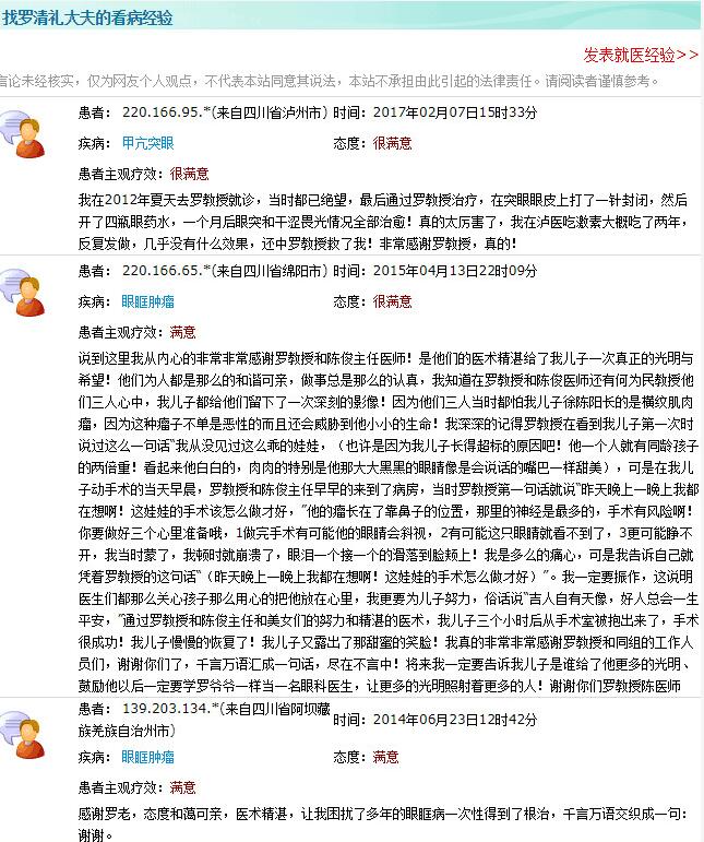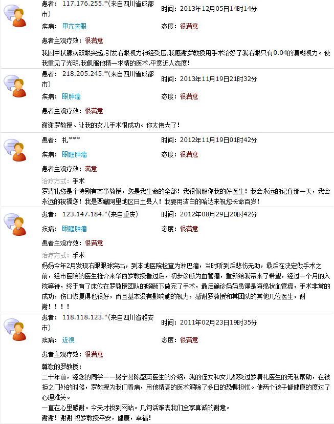 成都易游体育院长陈晓明教授、业务院长罗清礼教授网上患者评价