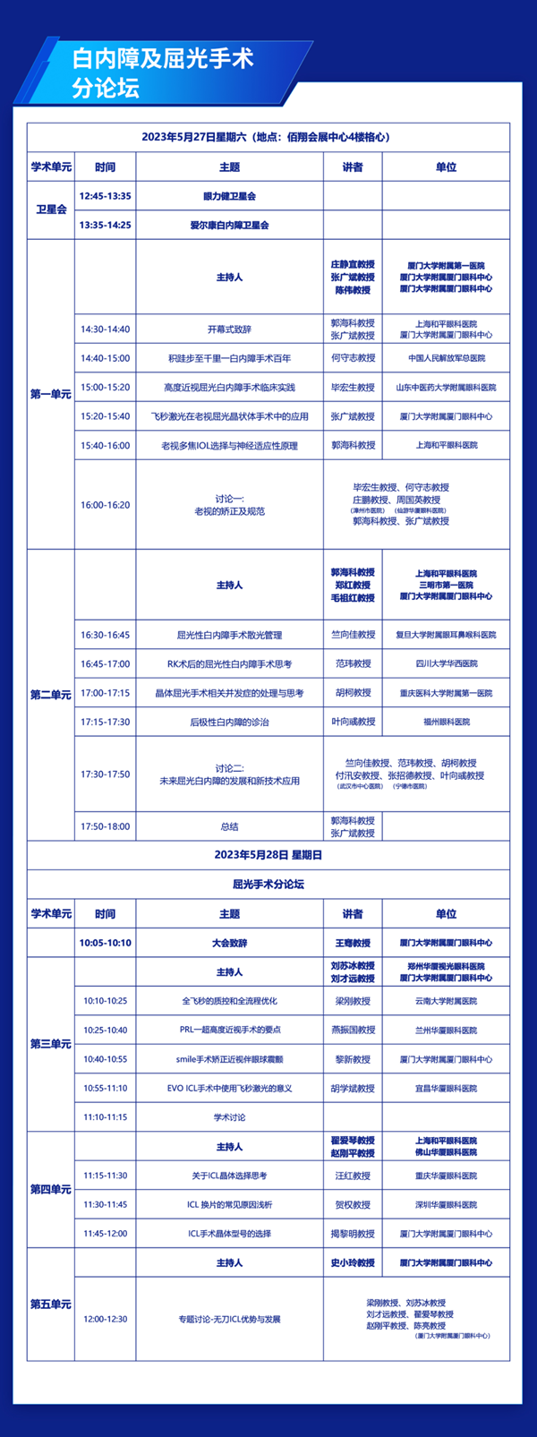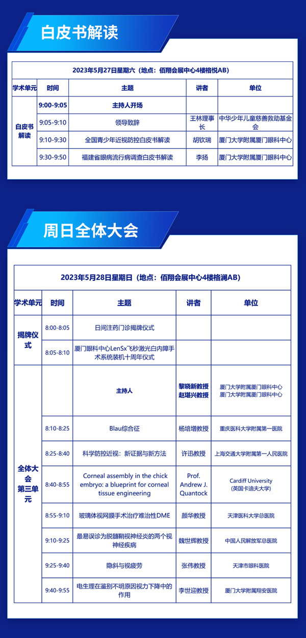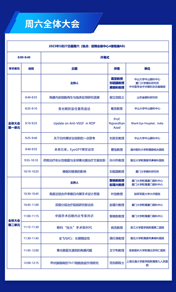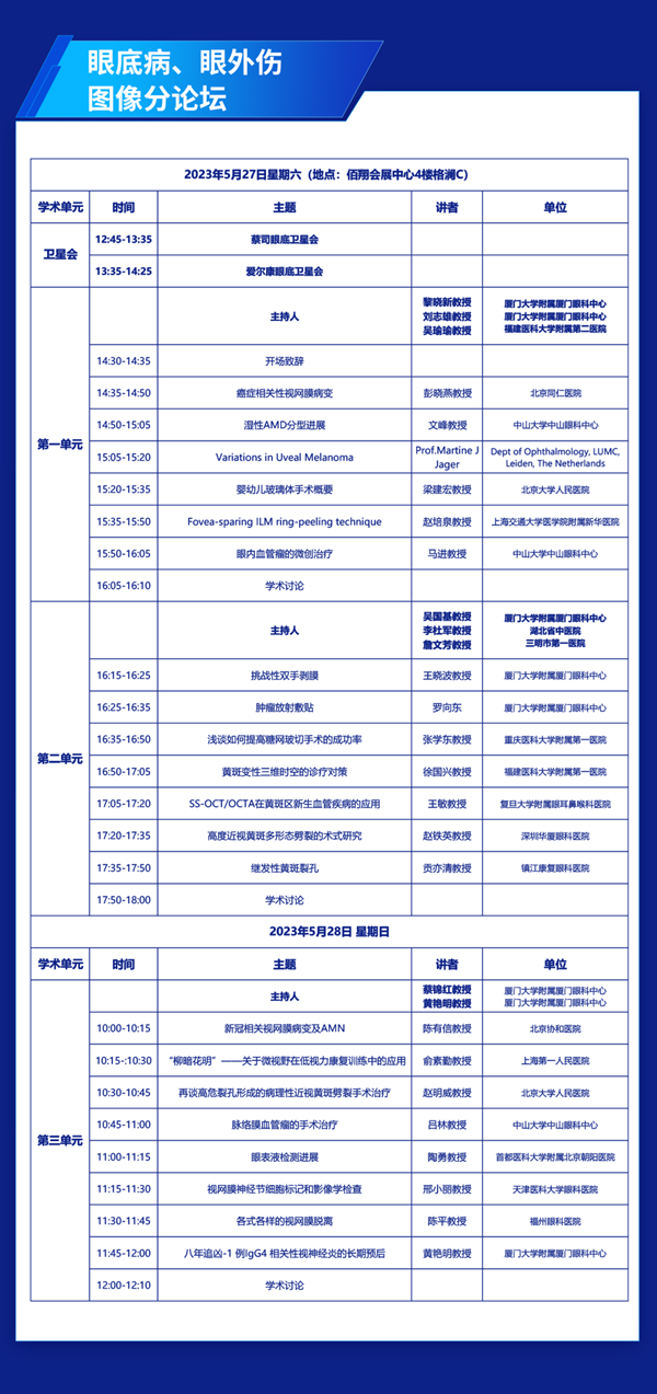 二零二三,鹭岛之滨,天高海阔,盛宴将启。第九届易游体育国际论坛将于5月27-28日在厦门佰翔五通会展中心举行。本届论坛十分荣幸地邀请到了黎晓新教授、赵堪兴教授、葛坚教授、孙兴怀教授、刘祖国教授共同担任大会主席,更有谢立信院士、姚克教授、王宁利教授、范先群院士、刘奕志教授、杨培增教授、许迅教授、瞿佳教授(按演讲顺序排序)等近百名国内眼科专家及国际知名眼科专家精彩授课。