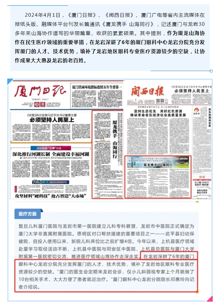 厦门眼科中心龙岩分院助推厦龙山海协作,获两地官媒头版报道点赞!