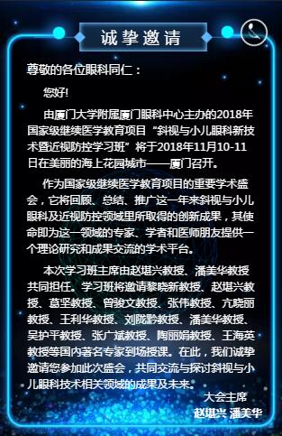 2018年厦门眼科中心继教项目斜视与小儿眼科新技术暨近视防控学习班将于11月10日在厦门举行。